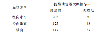 改進(jìn)后GV3在0~56%開(kāi)度(此時(shí)機(jī)組已達(dá)滿負(fù)荷)下振動(dòng)值基本保持穩(wěn)定,高噪聲現(xiàn)象消除。更換閥芯前后GV3閥桿處振動(dòng)實(shí)測(cè)結(jié)果如圖5所示,抗燃油管最大振幅見(jiàn)表2。改進(jìn)后閥芯流量特性有所變化,但依靠DEH的自動(dòng)調(diào)節(jié)性能可完全正常運(yùn)行。經(jīng)過(guò)一年多的運(yùn)行,2號(hào)汽輪機(jī)GV運(yùn)行穩(wěn)定,其后對(duì)1號(hào)汽輪機(jī)GV3也進(jìn)行了改造。