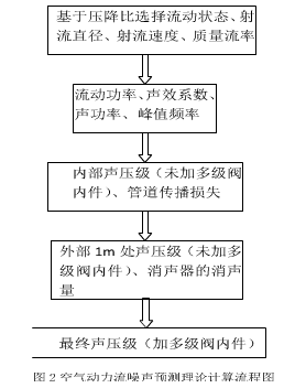 根據(jù)產(chǎn)品相關(guān)結(jié)構(gòu)參數(shù),按照標(biāo)準(zhǔn)IEC60534-8-3中未加多級(jí)閥內(nèi)件調(diào)節(jié)閥的噪聲預(yù)測(cè)公式進(jìn)行噪聲的理論計(jì)算,得到未加多級(jí)套筒閥內(nèi)件調(diào)節(jié)閥所產(chǎn)生的噪聲值,再根據(jù)馬大猷院士的氣體消聲器理論進(jìn)行多級(jí)套筒消聲量的計(jì)算,進(jìn)而得到加裝多級(jí)閥內(nèi)件后的調(diào)節(jié)閥最終噪聲值,其計(jì)算流程如圖2所示: