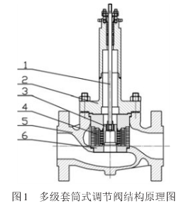 振動(dòng)和噪聲普遍存在于包含可壓縮氣體的節(jié)流和排放的應(yīng)用系統(tǒng)中。在噪聲嚴(yán)重的應(yīng)用系統(tǒng)中,聲波振動(dòng)不僅會(huì)對(duì)身體健康產(chǎn)生危險(xiǎn),而且會(huì)對(duì)設(shè)備的可靠性和系統(tǒng)運(yùn)轉(zhuǎn)造成威脅。調(diào)節(jié)閥作為流體控制類閥門,常常應(yīng)用于蒸汽、空氣等氣體的控制場(chǎng)合,就不可避免的要產(chǎn)生高噪聲,并伴隨強(qiáng)振動(dòng)。為改善這種狀況,應(yīng)用聲源處理法的多級(jí)套筒式調(diào)節(jié)閥出現(xiàn)。多級(jí)套筒式調(diào)節(jié)閥是一種有套筒導(dǎo)向的低噪音、防氣蝕調(diào)節(jié)閥,因套筒采用多級(jí)式能有效控制流體速度,避免流體對(duì)閥體及閥芯的直接沖刷,分級(jí)減壓不僅可以適應(yīng)氣體節(jié)流擴(kuò)散與膨脹,對(duì)控制高壓差可能出現(xiàn)的閃蒸和氣蝕有獨(dú)特的作用,可實(shí)現(xiàn)閥門在高溫高壓差工況下達(dá)到降噪降壓的效果。由于具有使作用在閥芯上的流體壓力平衡的結(jié)構(gòu),因此只須用較小的操作力便可達(dá)到穩(wěn)定調(diào)節(jié),能夠承受較高的工作壓差,使控制更加精準(zhǔn)。其結(jié)構(gòu)原理示意圖如圖1所示,1為閥桿,2為壓蓋,3為平衡閥芯,4為多級(jí)套筒,5為閥體,6為閥座。
