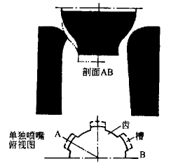 改進(jìn)方法是在接觸環(huán)處噴嘴開始的地方加工出多條擴(kuò)散狀凹槽,分別布置在噴嘴中,由相同尺寸的常規(guī)噴嘴分隔開,如圖3所示。這樣兩股汽流在交界面處發(fā)生強(qiáng)烈混合。由于粘性耗散的影響,如果激波發(fā)生,強(qiáng)度屬于中等。這種混合極其復(fù)雜,難以計(jì)算,但誘發(fā)的擾動(dòng)消除了。
