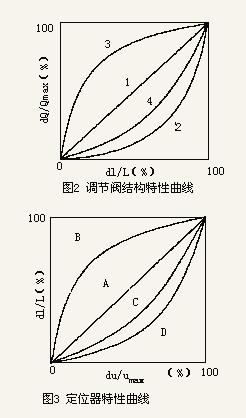 在沒安裝定位器的情況下,K1為一常數(shù)即閥行程與到閥控制信號(hào)成線性關(guān)系,此時(shí)調(diào)節(jié)閥的靜態(tài)特性即為其結(jié)構(gòu)特性,無法改變;如果安裝了定位器,則K1即為定位器的性能特性。對(duì)于機(jī)械力平衡式定位器來說可以通過更換反饋凸輪來加以改變,而對(duì)于智能型定位器由于預(yù)先進(jìn)行了程序設(shè)置,因此只需要通過功能鍵進(jìn)行選擇就可以任意改變K1,從而改變調(diào)節(jié)閥的靜態(tài)特性。當(dāng)現(xiàn)有調(diào)節(jié)閥的流量特性符合需要時(shí),只需將定位器特性設(shè)置為線性。