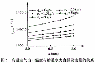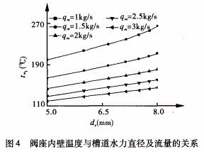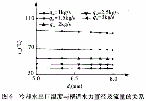圖4、5分別表示閥座內(nèi)壁溫度和高溫空氣出口溫度隨槽道水力直徑及冷卻水流量的變化趨勢。
