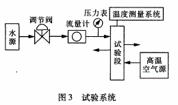 冷卻水由水源流出,經(jīng)調(diào)節(jié)閥調(diào)至合適流量后,進入到試驗段的閥座矩形槽中,當高溫空氣流經(jīng)試驗段的閥座中腔通道時,則會與冷卻水進行對流換熱。試驗段裝有溫度測量系統(tǒng),可對冷卻水和高溫空氣進的出口溫度及閥座壁面溫度進行測量。