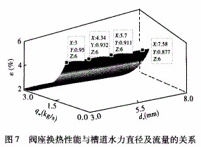 顯然,換熱性能ε與槽道的水力直徑de及冷卻水流量qm密切相關(guān)。為保證槽道內(nèi)冷卻水為單相流,ε的最大值為6%。以de為X軸,qm為Y軸,通過Matlab擬合出關(guān)于換熱性能ε的三維曲面,如圖7所示。分析換熱性能時,應(yīng)控制槽道水力直徑不得低于3mm,以保證能采用常規(guī)理論計算,且不得高于8mm,以保證閥座不被高溫氧化。