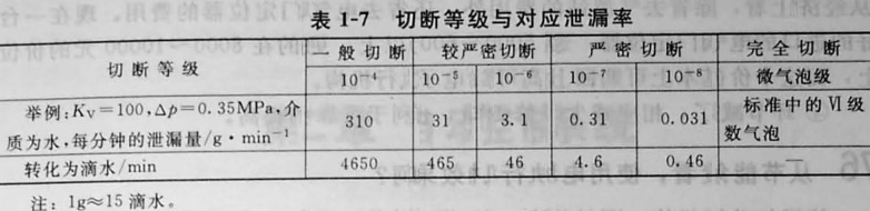 上述標(biāo)準(zhǔn)分還不夠細(xì)膩,特別是IV級(jí)密封和V級(jí)密封,其泄漏率由10-4突然躍到10-7。為此,認(rèn)為應(yīng)將泄漏標(biāo)準(zhǔn)與切斷的關(guān)系進(jìn)一步細(xì)分。切斷的等級(jí)與對(duì)應(yīng)的泄漏率見(jiàn)表1-7.